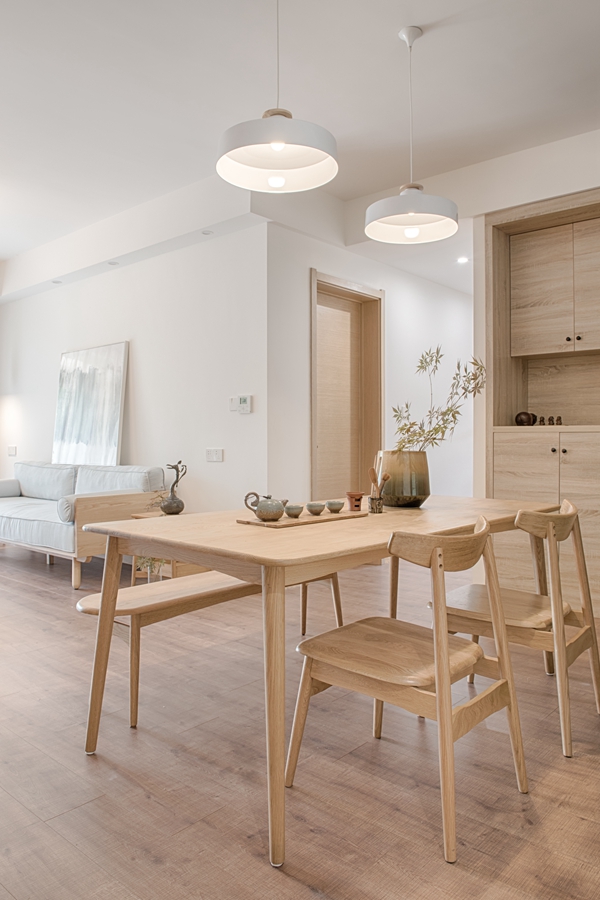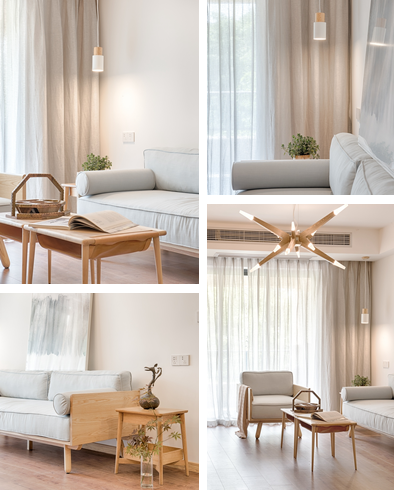 “借景”将户外的景色与阳光引进。采用原木色调的家具搭配深色的地板,主体色彩将以白色为基色,搭配原木家具,少量灰色点缀营造原木情节的岁月静好。