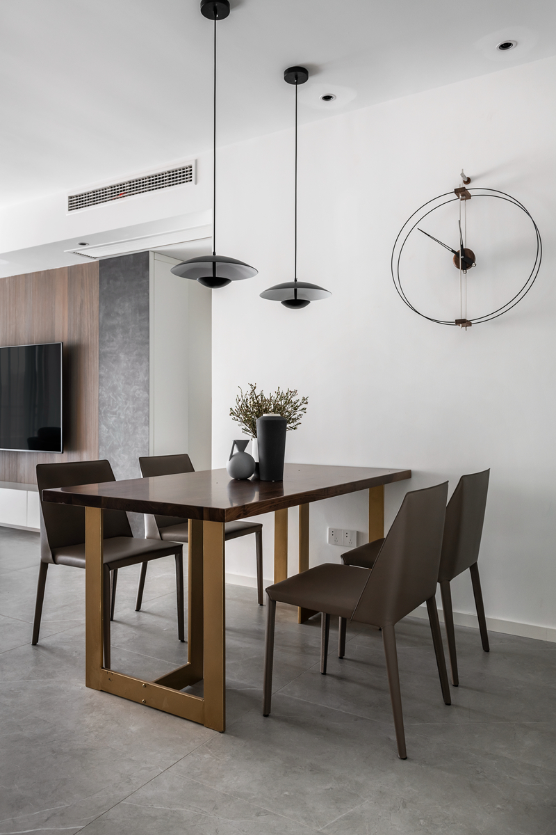 餐厅区域面积较小,考虑到进入厨房的动线问题,所以把原来的厨房滑门扩大到1.6米,然后滑门与餐桌之间留有1.1米的距离,来保证平时可以顺畅的进出厨房。餐厅墙面的挂钟样式挂件是业主喜欢很久的物件,所以软装落地的时候就安排上了。