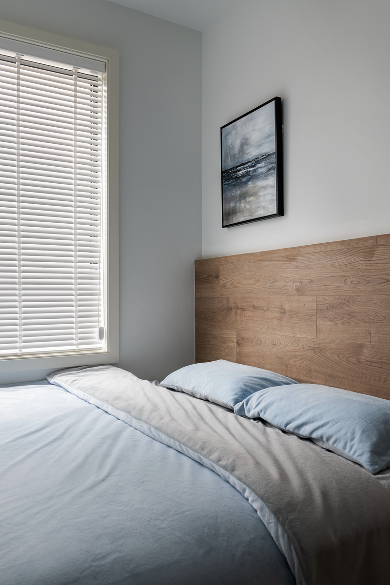 次卧因为是年轻人暂时短居,过两年就会搬出去住,而原本的房间每间都很小,都不太好用,所以把原来的两件小卧室联通,形成一个相对较大一点的房间,同时也保证了充足的采光和通风。由于次卫占据了次卧的一小部分空间,正好利用这个凹凸的区域做了次卧的衣柜,日常两个人的衣服基本够房,换季的可以换到过道准备的衣柜。同时在房间增加了斗柜的摆放可以收纳小件用品,大大提高衣柜的可利用率,另外,也利用飘窗这里的采光,设置了书桌的区域,也能满足年轻人用电脑或者看书的一些需要。