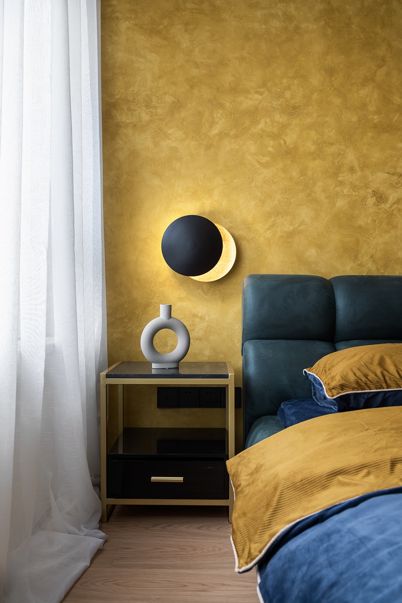 延续客厅墙面的色彩花纹,注重设计语言的统一性,形成不同空间中记忆上的连接,将不同功能的空间贯通为一个整体。灰色肤感柜门在高饱和度的空间内,扮演一个降噪者的角色。